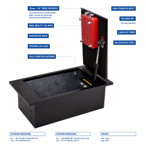 The VS-15FL floor safe is designed to provide hidden and secure access to valuables or firearms, making it an ideal choice for discreet storage in locations like floors or concealed spaces.