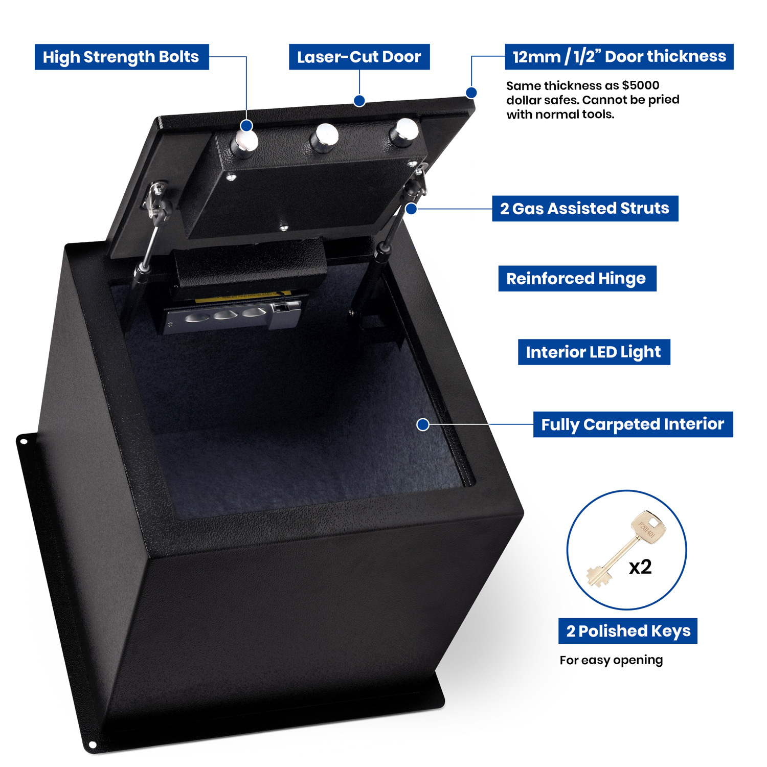 The VS-18FL floor safe is designed to provide hidden and secure access to valuables or firearms, making it an ideal choice for discreet storage in locations like floors or concealed spaces.