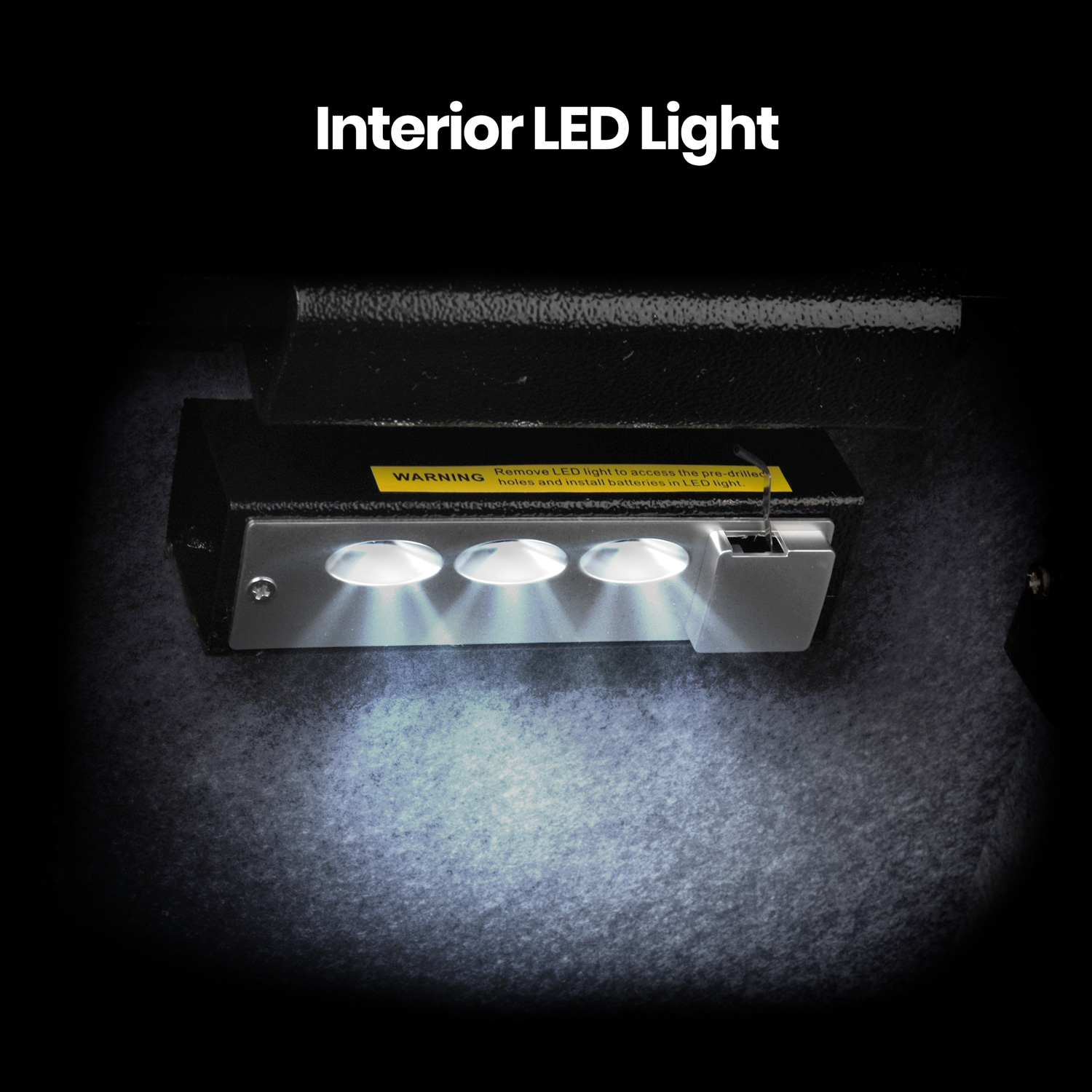 The VS-18FL includes 2 gas-assisted struts for smooth door operation, a reinforced hinge for durability, and a high-security double-bit key lock with 2 polished keys for easy access. Inside, you’ll find a fully carpeted interior with LED lighting to protect and illuminate valuables. Its powder-coated finish inside and out ensures lasting durability.